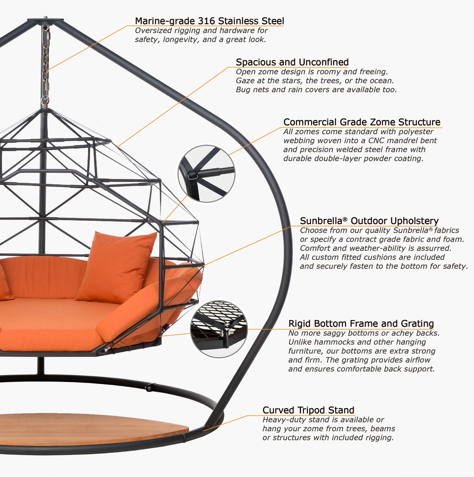 Zomes are a geometric shape with an incredibly strong and secure structure. They hang from a singular overhead point the allows for a gentle swinging motion.
